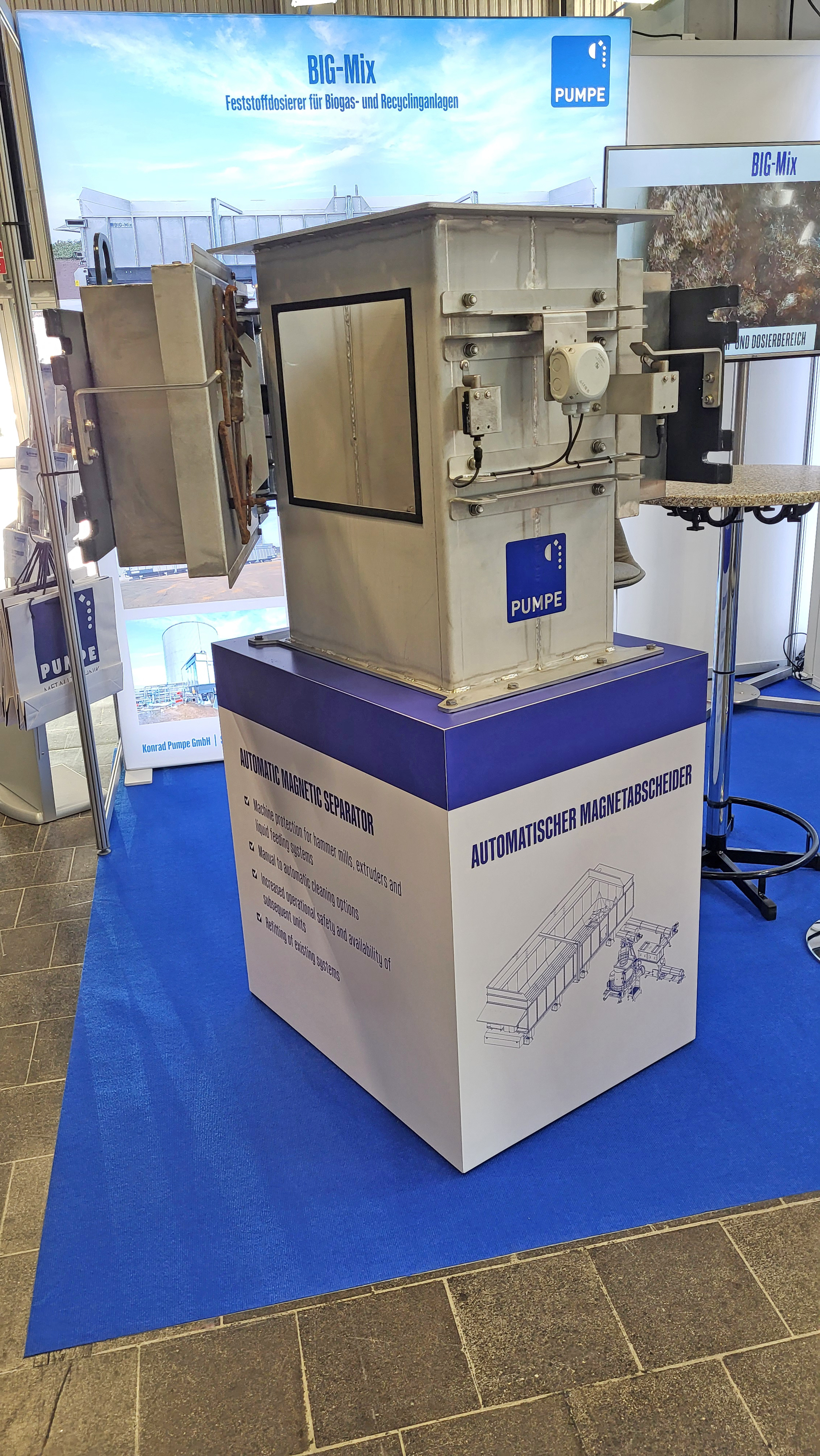 Ein besonderes Highlight war die Premiere unseres automatischen Magnetabscheiders, der erstmals auf dieser Messe dem Fachpublikum vorgestellt wurde. Der Magnetabscheider schleust metallische Stoffe effizient aus dem Substrat und schützt dadurch nachgeschaltete Maschinen wie Hammermühlen, Extruder und Flüssigeintragssysteme vor Schäden. Ebenso erhöht er die Betriebssicherheit und Verfügbarkeit der nachfolgenden Aggregate und kann auch für Bestandsanlagen nachgerüstet werden. Je nach Ausführung kann der Magnetabscheider manuell oder vollautomatisch abgereinigt werden.