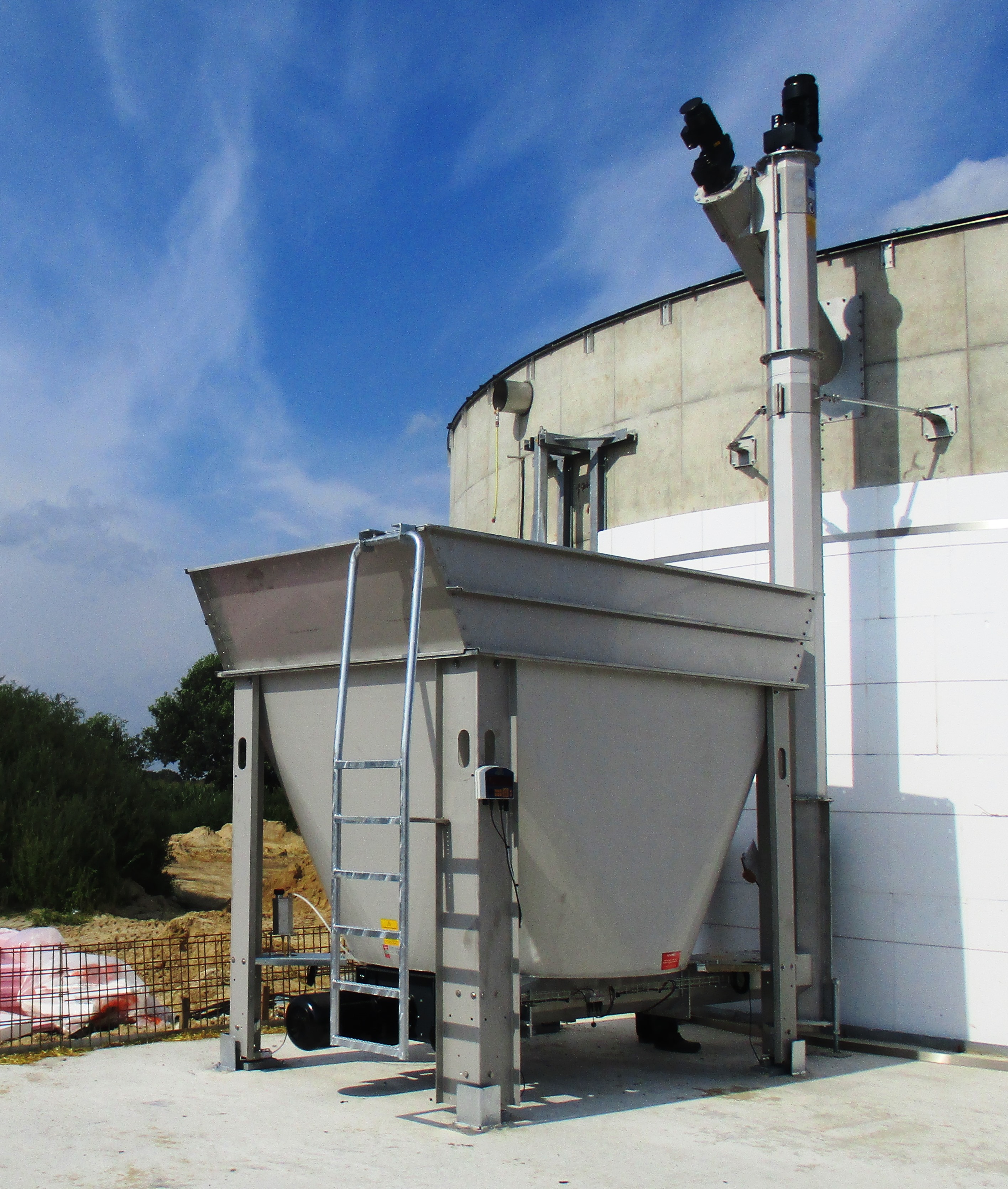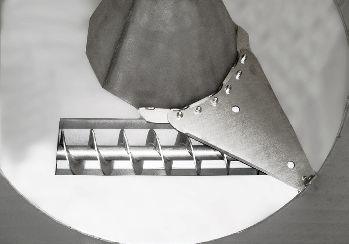 For the processing of difficult substrates such as solid and poultry manure, vertical mixing screws made of stainless steel are used as standard. The mixing screws can be equipped with stainless steel cutting blades. The processed substrate is transferred to the subsequent feeding technology via a sub-screw. The dosing blade inside the dosing unit transfers the substrate to the feed screw mounted below the solids dosing unit. This ensures a constant feed rate.